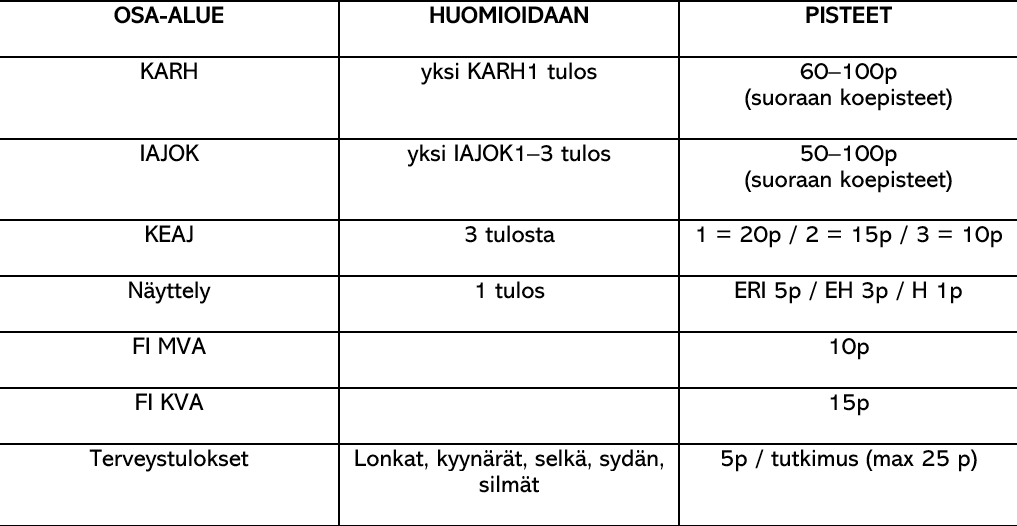 Tasapisteissä ratkaisee korkein 1) KARH1 2) IAJOK1 3) nuorempi koira